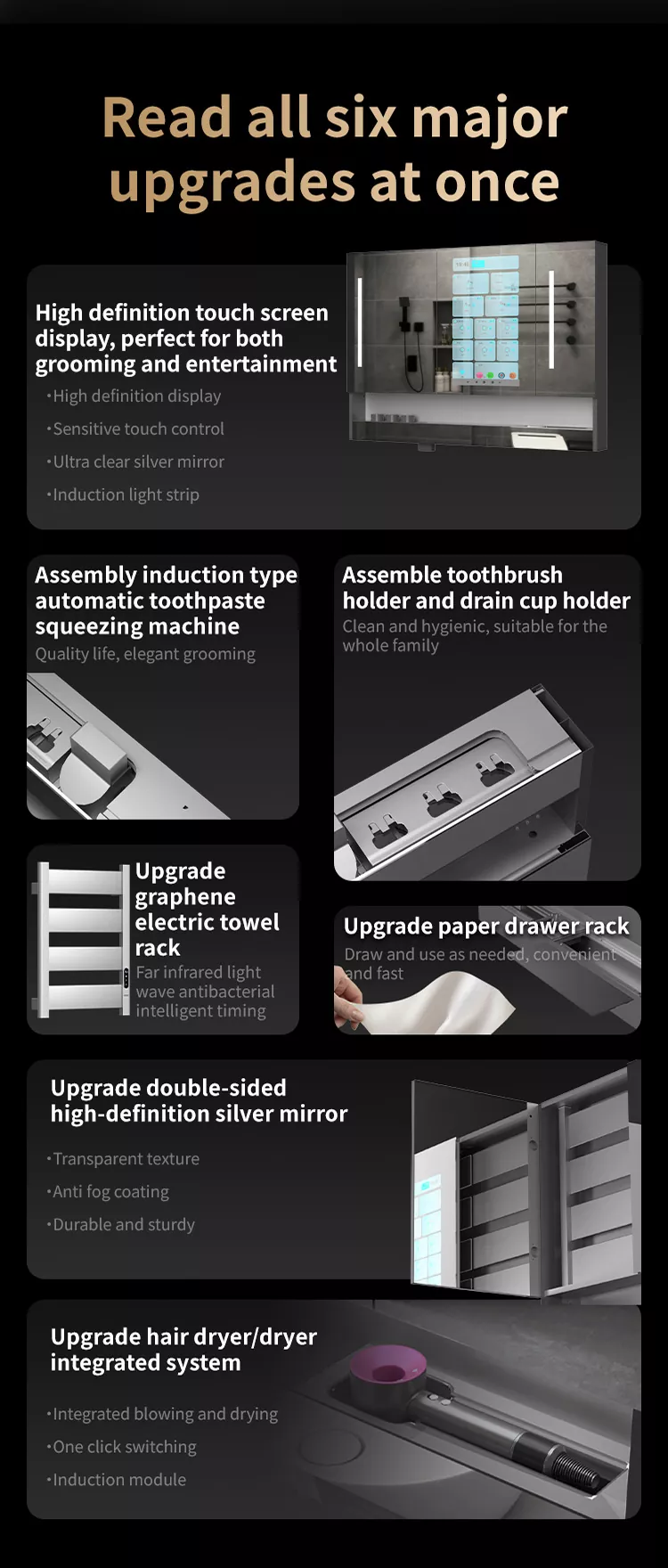 Led lamp strip, automatic toothpaste squeezing machine, tooth cup draining rack, tooth cup toothbrush ultraviolet disinfection device, embedded paper drawing box, hair dryer/dryer dual-purpose conversion device, mirror high-definition display touch screen, mirror defogging system, shaver sterilization, towel rack ion purification, induction hand sanitizer module, integrated control center, graphene heating and drying towel Rack, sistema de fragancias inteligente, sistema de purificación de aire