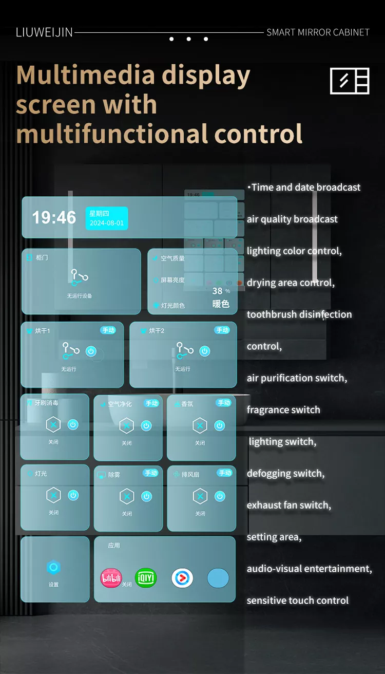 Este gabinete de espejo de baño inteligente de grafeno liuwei Jinshi está hecho de material de aleación, que es duradero y a prueba de humedad. Fuera de luz LED estándar, máquina de recolección automática de pasta de dientes, estante de drenaje de copa de dientes, dispositivo de desinfección de cepillo de dientes de copa de dientes para el dispositivo de desinfección de seco/dispositivo de desinfección de la barra de cáscara, el cajón de la altura de la altura de la altura de la altura de la altura de la altura de la altura de la doble delgada para el pelo de la altura de la altura de la altura de la altura de la caja de la mano. Pantalla táctil, desinfectante para manos de inducción, sistema de desfogación de espejo, centro de control de tipo Cheng. El modelo de lujo está equipado con una rejilla de toallas de calefacción y secado de grafeno, sistema de fragancia inteligente y sistema de purificación de aire. Además, la pantalla grande admite el entretenimiento de audio y video, pantalla clima y tiempo, descarga de aplicaciones, etc., para enriquecer su vida.