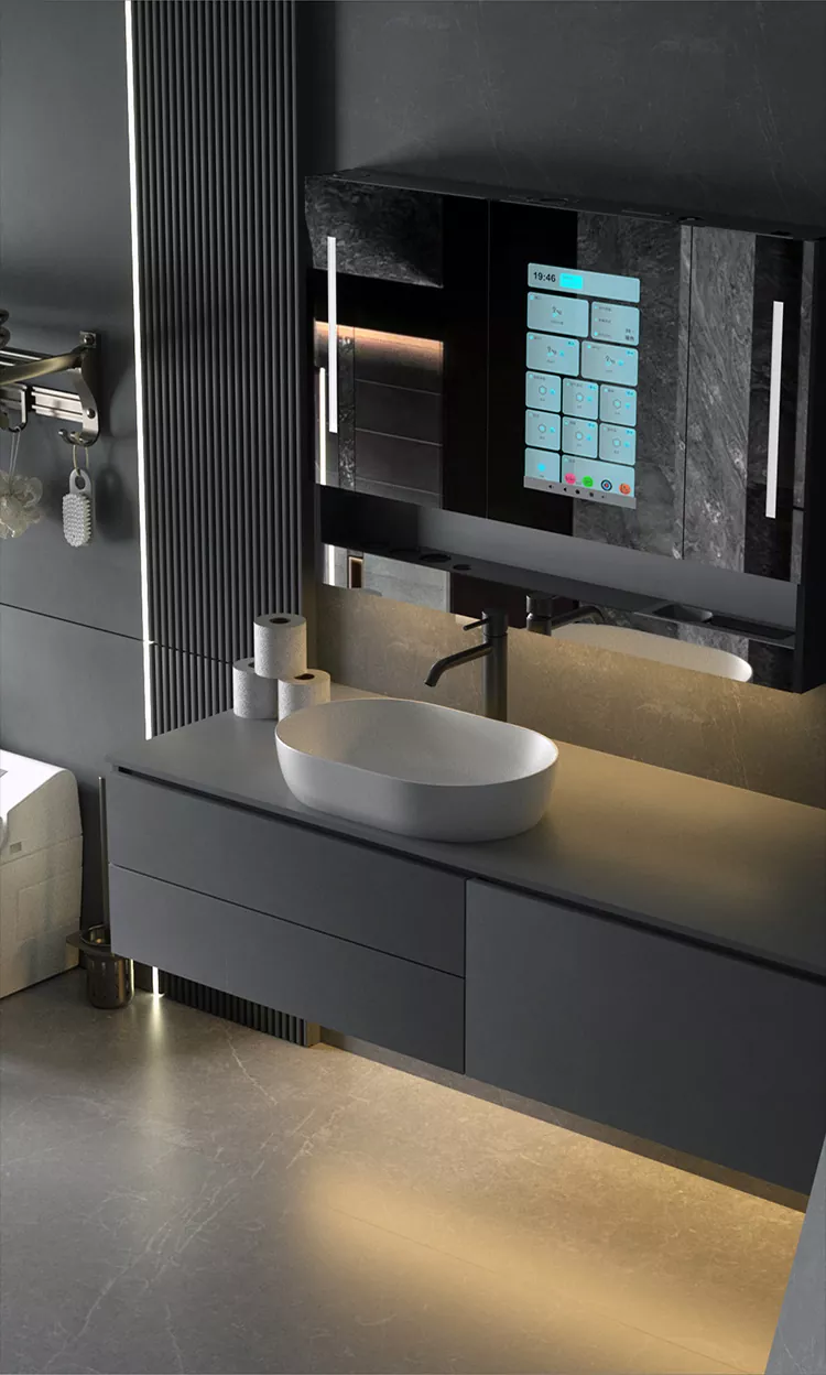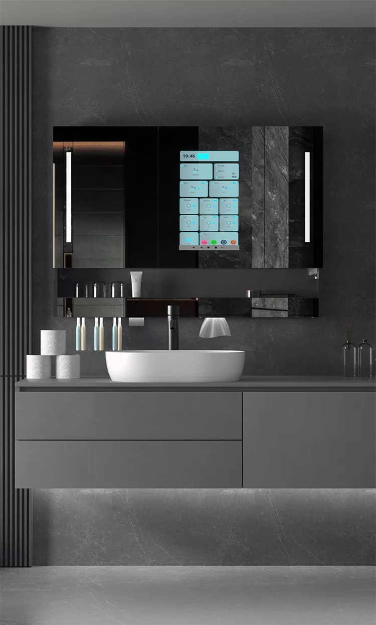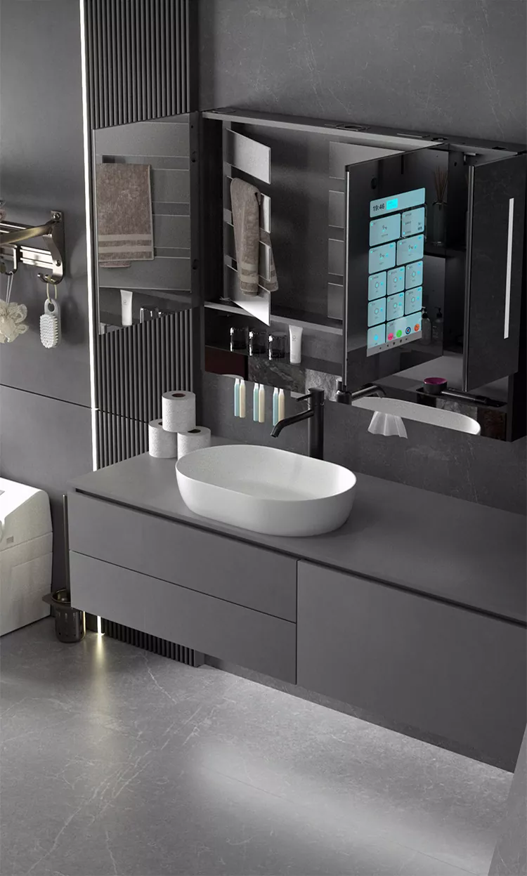 Como pionero de Graphene Life, Meshow defiende el concepto de "Nuevos materiales, nuevas tecnologías y nueva vida". Este gabinete de espejo de grafeno inteligente se personaliza. El producto utiliza el fuselaje de aleación, la pulverización de la capa múltiple, el fuselaje es duradero y a prueba de óxido. El espejo del gabinete de espejo está equipado con una pantalla táctil de espejo y un chip inteligente. Puede completar el control multifuncional y el entretenimiento audiovisual en la pantalla. Support de la aplicación de descarga personalizada. El producto tiene funciones ricas. Todos los modelos están equipados con tira de luz LED estándar, máquina de expulsión automática de pasta de dientes, estante de drenaje de copa de dientes, copa de dientes de desinfección ultravioleta de cepillo de dientes y dispositivo de desinfección de rasurador de rasurador. Además, equipado con una rejilla de toallas de calefacción y secado de grafeno, desinfectante de manos de inducción, sistema de fragancia inteligente y sistema de purificación de aire.